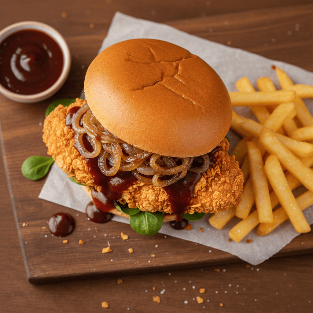 Tuesta el pan 1 minuto en la AirFryer apagada (con el calor residual). Unta la base con un poco de salsa BBQ, coloca el pollo, una montaña de cebolla caramelizada y un chorro extra de salsa por encima. ¡Sirve las patatas al lado y a disfrutar!