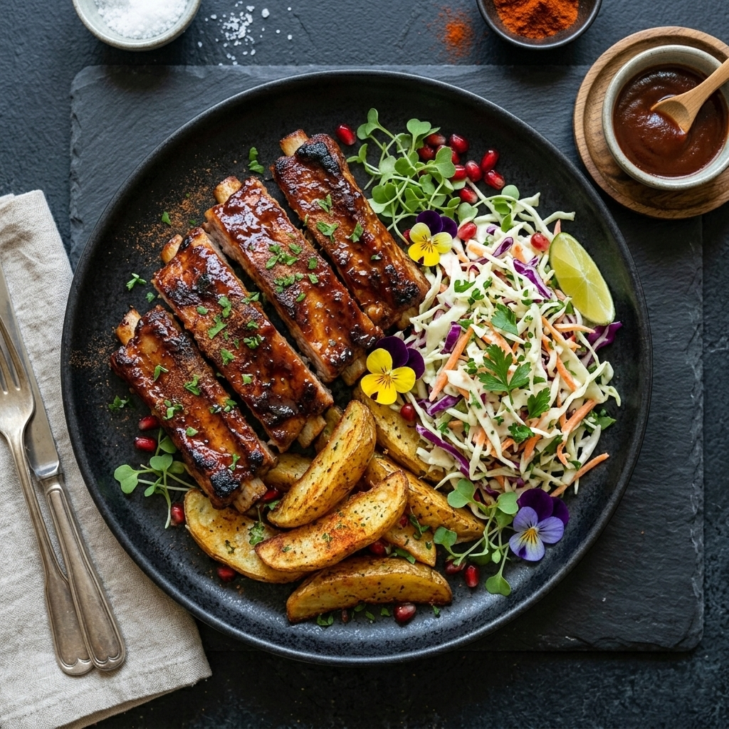 Bienvenidos de nuevo. Hoy elevamos nuestras costillitas glaseadas a la categoría de menú completo. Vamos a preparar, de forma simultánea, unas patatas gajo crujientes en la freidora de aire y una ensalada de col (Coleslaw) refrescante que equilibra perfectamente el dulzor de la manzana y la canela. Un plato redondo, libre de gluten y lleno de texturas.