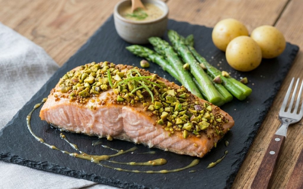 - El Montaje: Salpimenta el salmón. Pincela la parte superior con la mezcla de miel y mostaza y, seguidamente, presiona los lomos contra el plato de pistachos picados hasta que queden bien cubiertos.